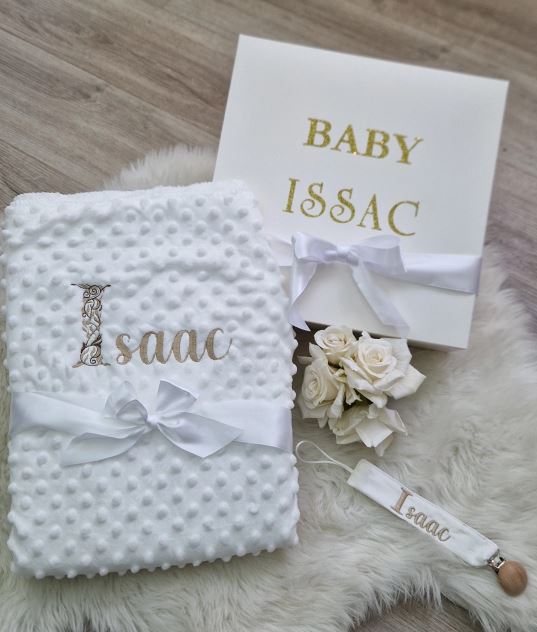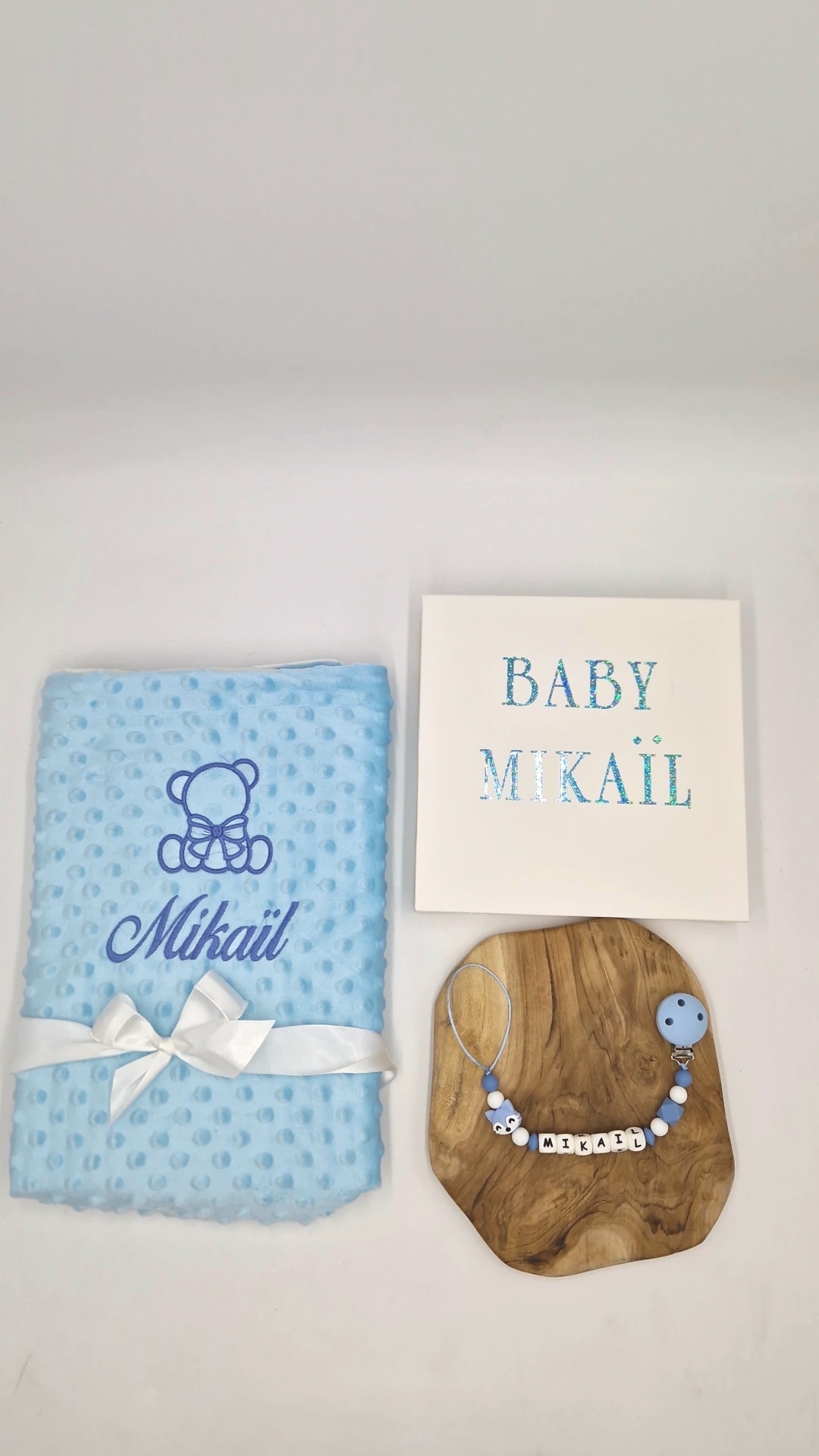 Coffret composé d’une couverture minky, une attache tétine en silicone.